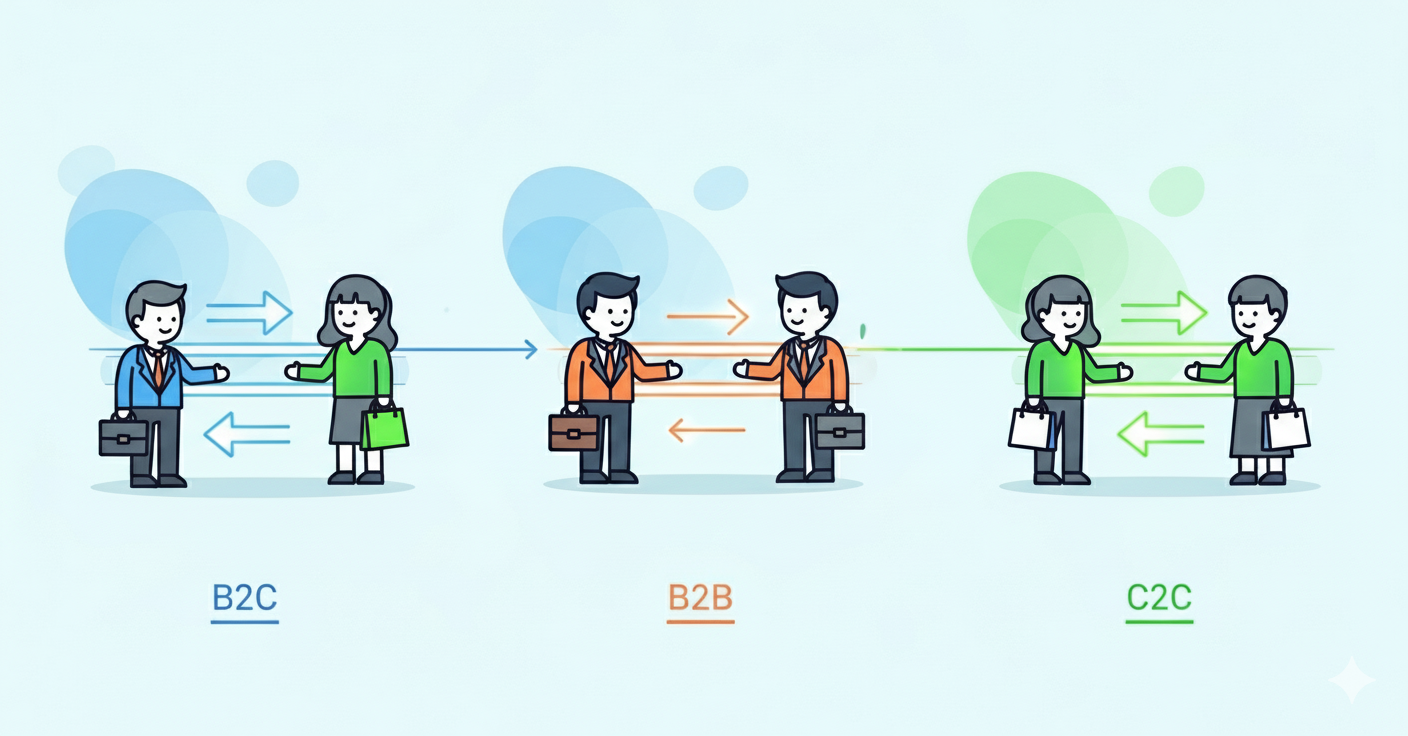 C2C(消費者對消費者)個人之間的買賣行為蝦皮拍賣、旋轉拍賣入門門檻低,靈活性高,但信任度較低